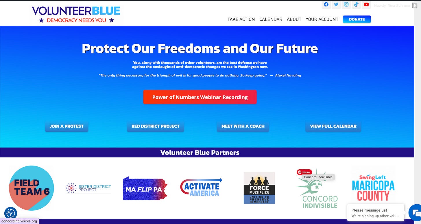 Formed in 2020, Volunteer Blue now has over 40 partners who provide volunteer opportunities. “We act as a clearinghouse for effective activities,” say Rina Schneur, VB co-founder. Volunteer Blue and its partners offer curated actions, each designed to flip or protect Congressional seats in key elections. Along with its calendar, VB’s “Help Wanted” webpage lets organizations post jobs that require a specific skillset (e.g., webmaster).