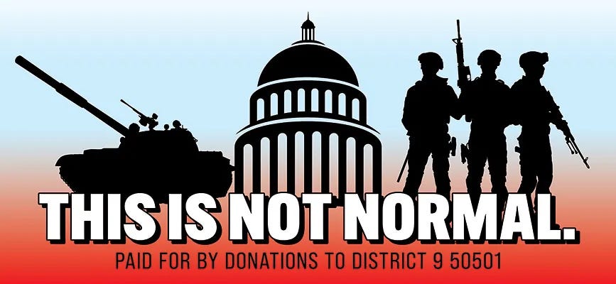 The title “THIS IS NOT NORMAL” is adaptable to many situations and applies to so much of what this regime is doing — ignoring the constitution, laws, and even directives by judges. It does not say “ICE,” “Defund ICE,” or even mention “Trump,” nor does it suggest specific actions. It is an image that is immediately arresting and evokes a visceral response. The title is short enough to be printed in large, visible typeface.
